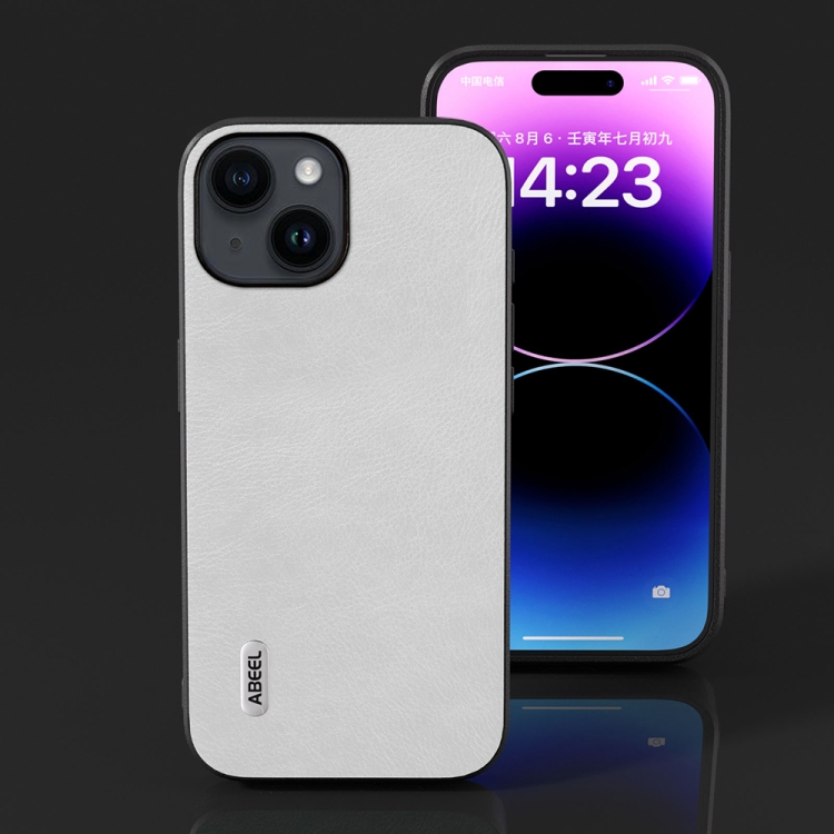Funda para iPhone 15 Plus Abeel Dual Color Lichi Texture PU Blanco