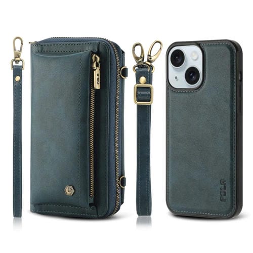 Funda para iPhone 15 Plus Crossbody Cuero con Billetera y Cremallera Multifuncional (Verde)