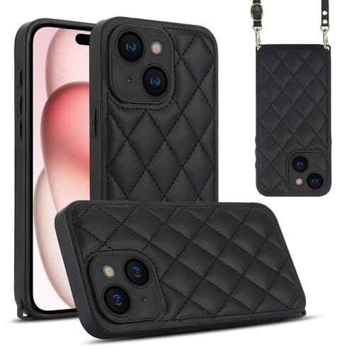 Estuche para Teléfono iPhone 15 Plus Textura Rómbica Cordón Doble (Negro)