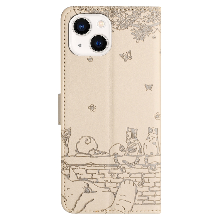 Estuche para Teléfono iPhone 15 Plus Cuero Estampado de Gato en Relieve con Cordón (Beige)
