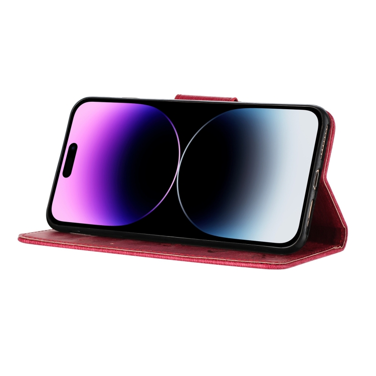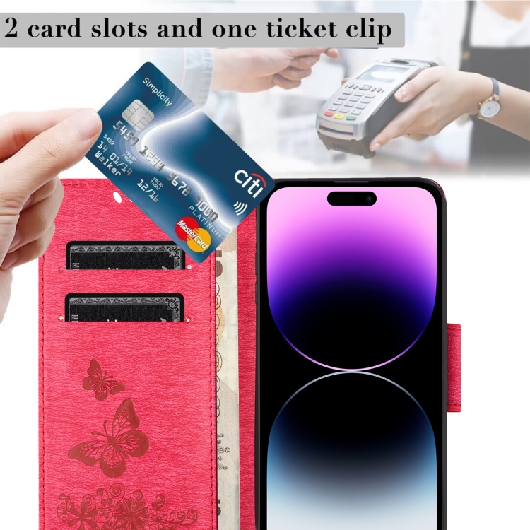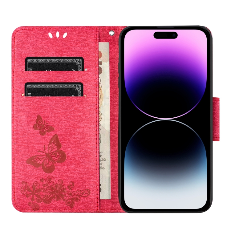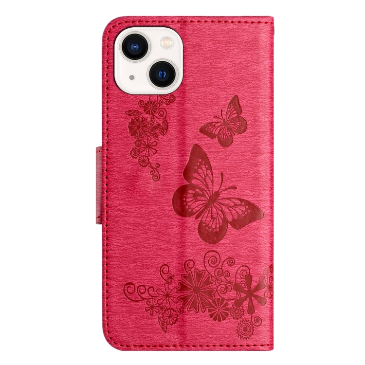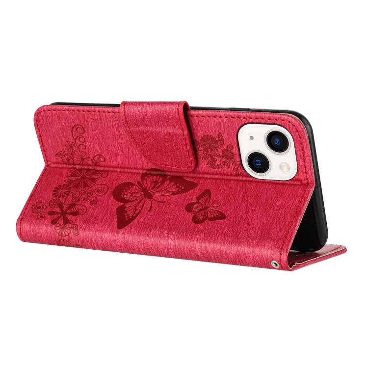 Funda para iPhone 15 Plus Cuero con Tapa y Relieve de Mariposa (Rojo)