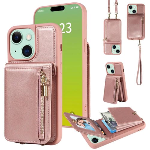 Funda para Teléfono iPhone 15 Plus Cuero Billetera Cremallera Cordón Cruzado (Oro Rosa)