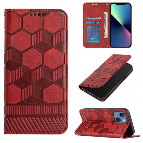 Funda de teléfono para iPhone 15 Plus con tapa de cuero magnético y textura de fútbol (Rojo)