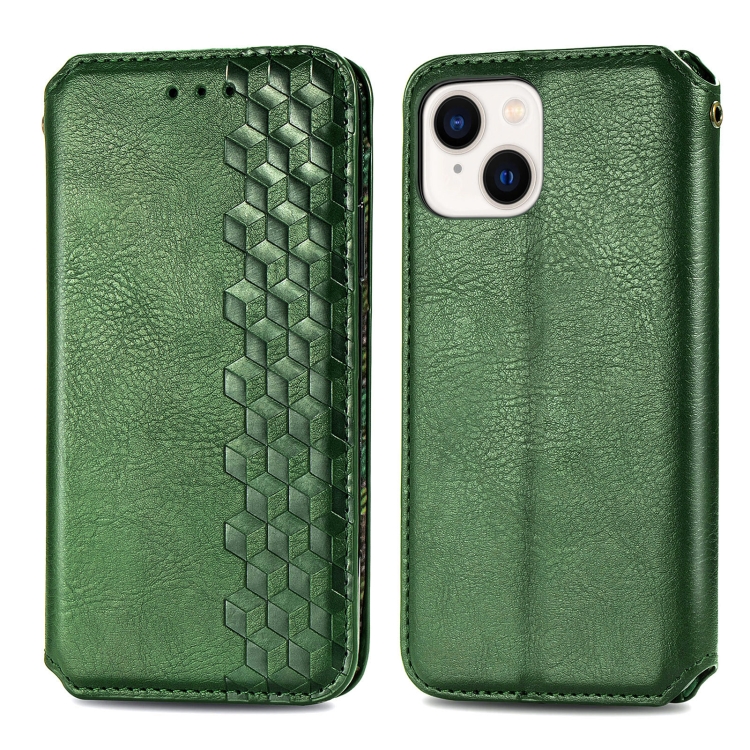 Funda para Teléfono iPhone 15 Plus Cuero Magnético Prensado Rejilla Cúbica (Verde)