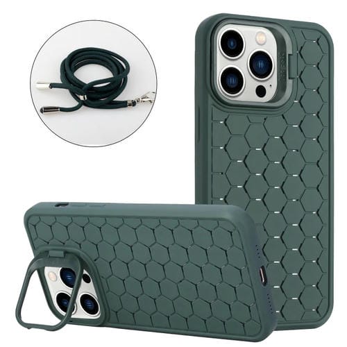 Funda para Teléfono iPhone 15 Pro Honeycomb Radiating Holder TPU con Cordón (Verde)