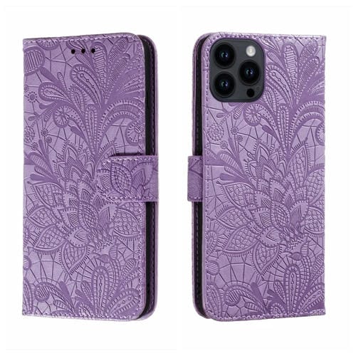 Funda para Teléfono iPhone 15 Pro Max Cuero con Tapa y Estampado de Flores de Encaje (Púrpura)