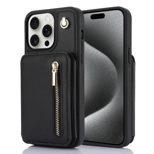 Estuche para Teléfono Ym006 para iPhone 15 Pro con Bolsa para Tarjetas con Cremallera y Sensación de Piel con Cordón Doble (Negro)