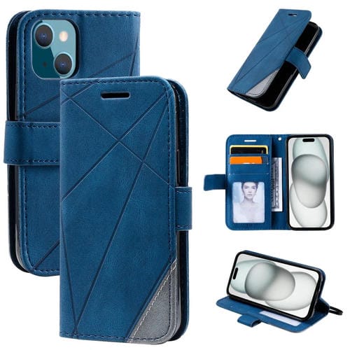 Funda para teléfono iPhone 15 Skin Feel Splicing de Cuero (Azul)