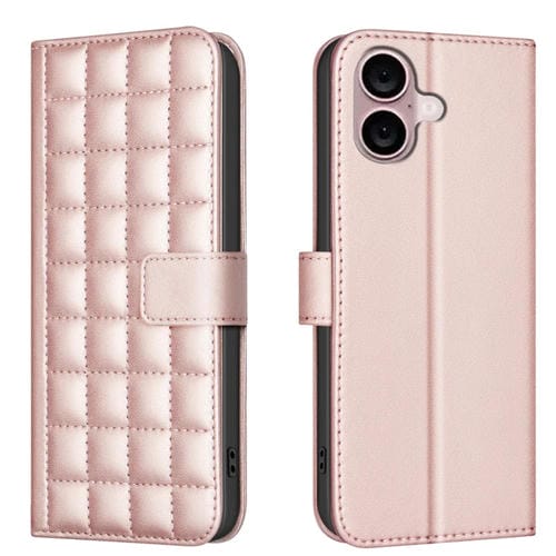 Funda de Cuero para iPhone 16 Plus con Textura Cuadrada (Oro Rosa)