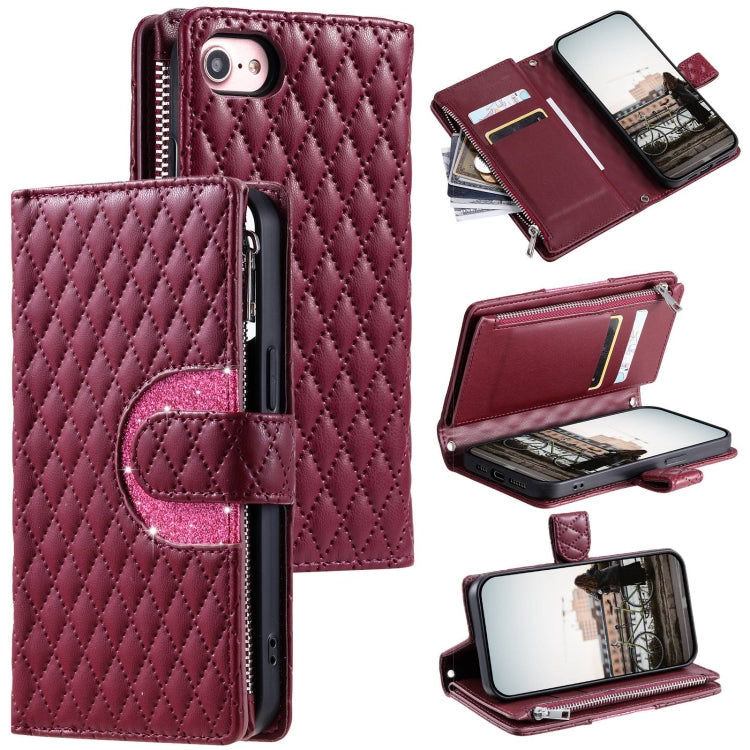 Estuche de Cuero para iPhone 7/8/SE 2022 con Billetera, Cremallera y Purpurina (Rojo Vino)