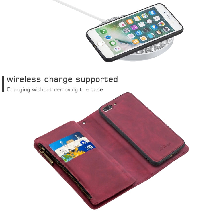 Estuche para iPhone 8 Plus Skin Feel Cuero Pu con Cremallera Magnética Desmontable Tapa Horizontal Ranuras Tarjetas Soporte Billetera Marco Fotos Cordón (Rojo)