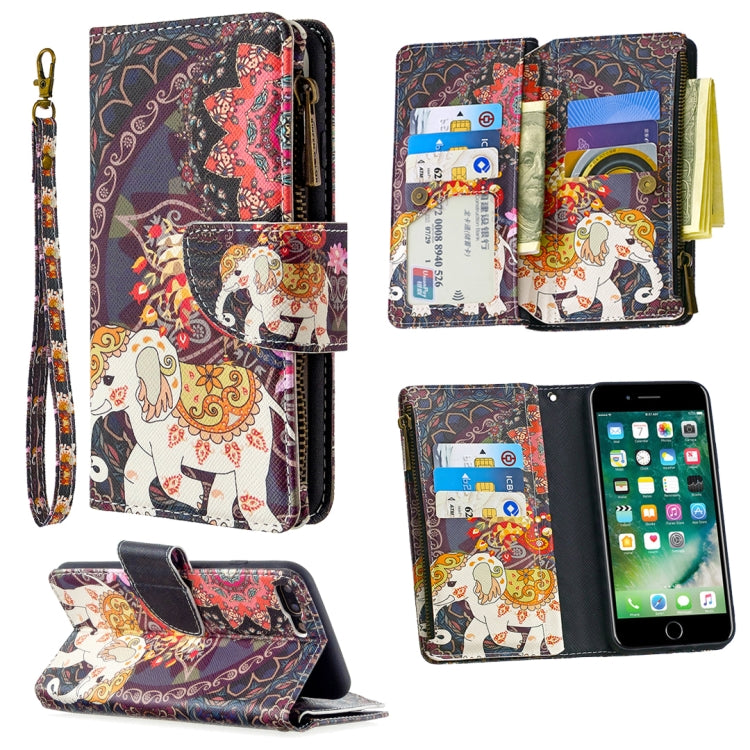 Funda de cuero para iPhone 8 Plus y 7 Plus con patrón de dibujo colores cremallera tapa horizontal soporte ranuras tarjetas billetera (Elefantes de Flores)