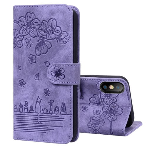 Estuche para iPhone X / Xs Cartoon Sakura Cat Cuero En Relieve (Púrpura)