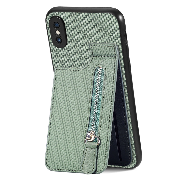 Funda de teléfono iPhone X / Xs con cremallera vertical de fibra de carbono (Verde)