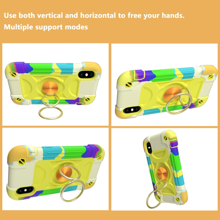 Funda Protectora Silicona + PC con Soporte Doble Anillo para iPhone X / Xs (Verde Amarillo)