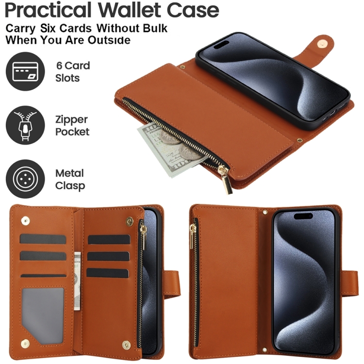 Funda de Cuero Ym016 para iPhone X y Xs con Billetera, Tarjeta, Cremallera Rómbica y Cordón (Marrón)