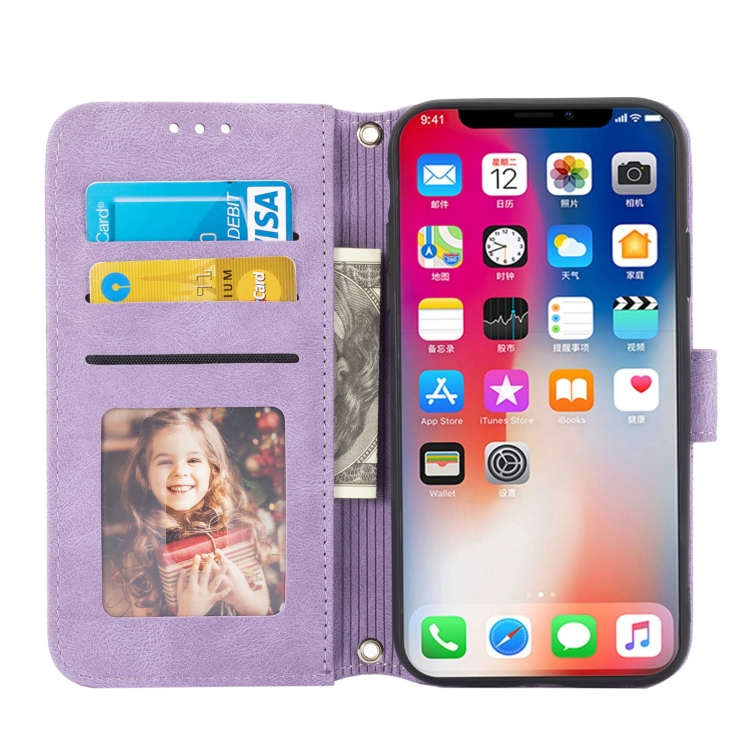 Estuche de Cuero para iPhone Xr Hebilla Magnética a Rayas En Relieve Pu + TPU con Tapa Horizontal Soporte Ranura Tarjeta Billetera Marco Fotos Eslinga (Púrpura)