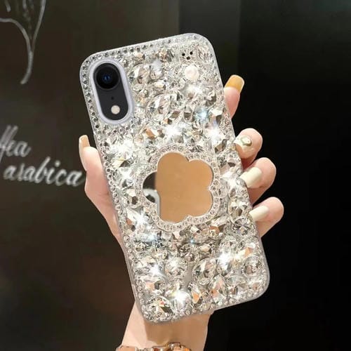 Funda para iPhone Xr Mirror PC con Diamantes de Imitación Hecha a Mano (Flor Gris Plateada)