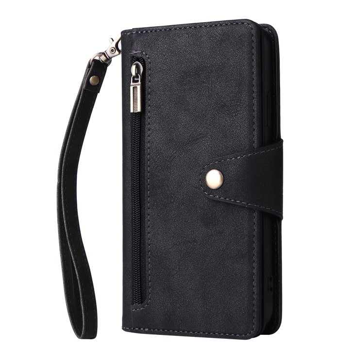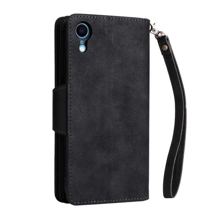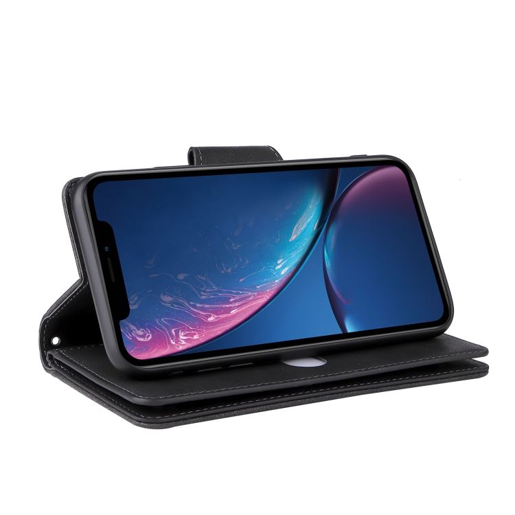 Funda de teléfono iPhone Xr Rivet Buckle 9 tarjetas cuero tres pliegues (Negro)