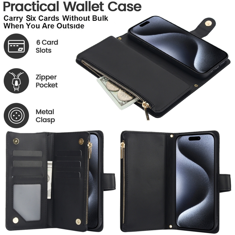 Funda para iPhone Xs Max Ym016 de Cuero con Billetera, Tarjeta, Cremallera Rómbica y Cordón (Negro)