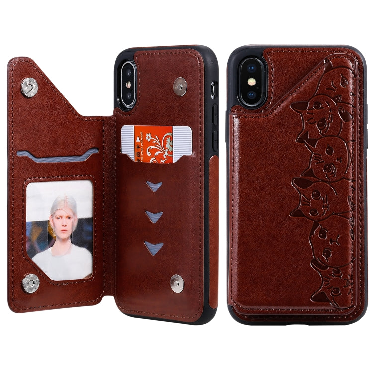 Estuche protector para iPhone Xs Six Cats con patrón en relieve, soporte, ranuras para tarjetas y marco de fotos (Marrón)