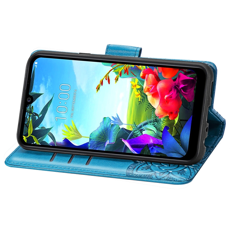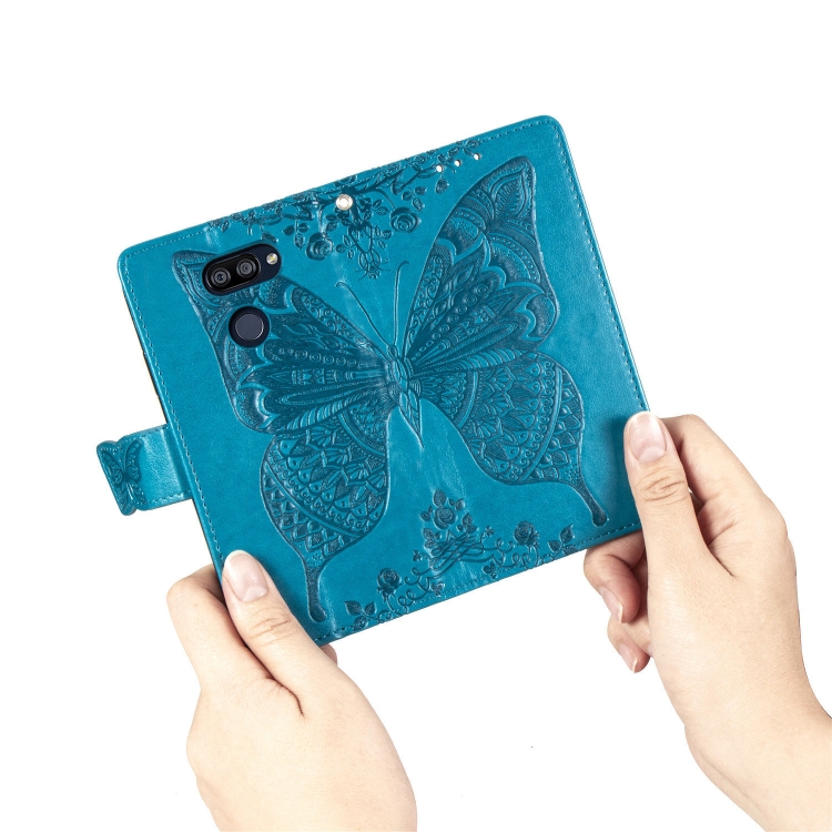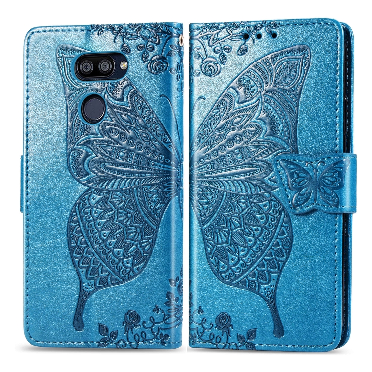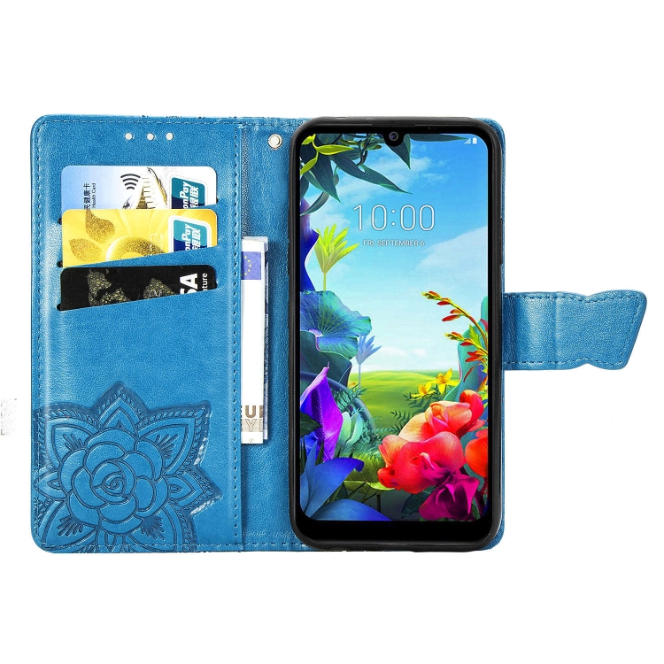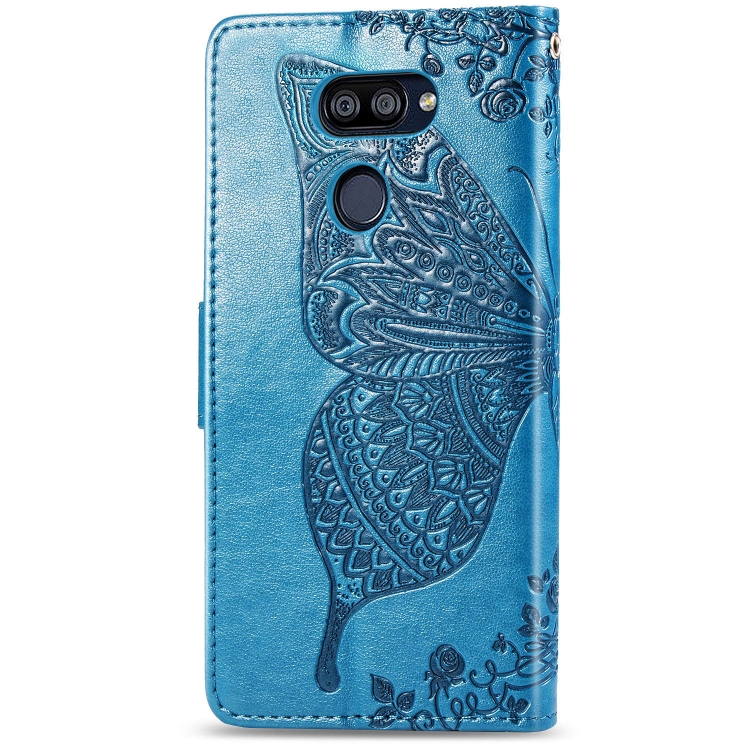 Funda de Cuero para LG K40S Butterfly Love Flower con Tapa Horizontal, Soporte, Ranura para Tarjeta y Cordón (Azul)