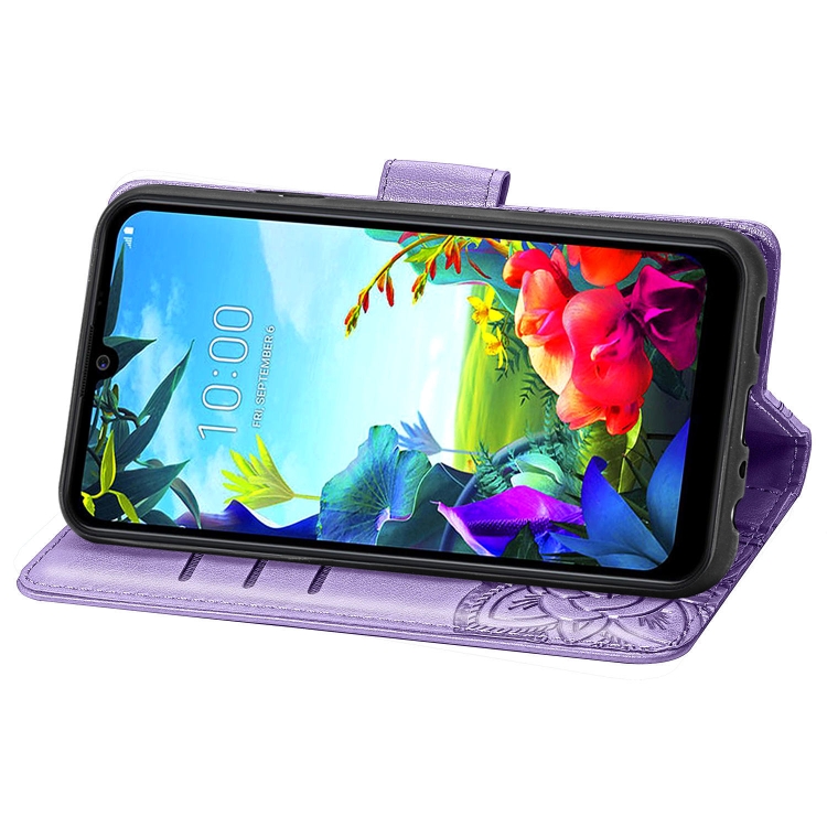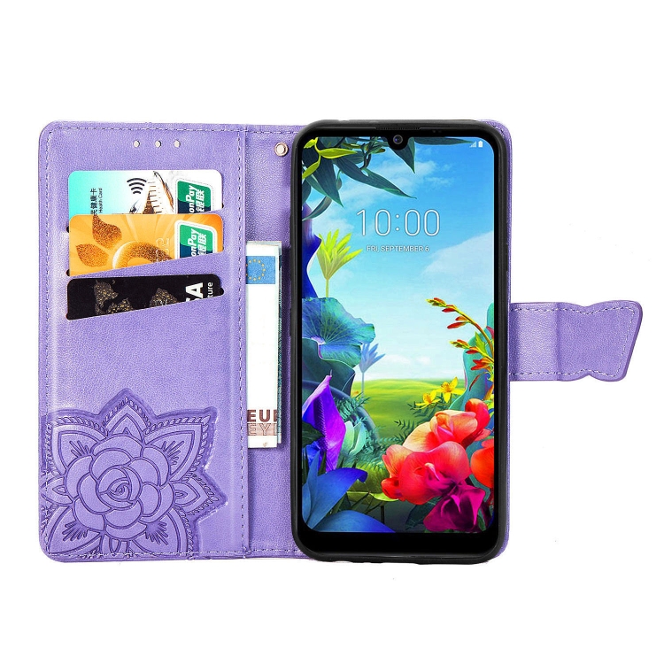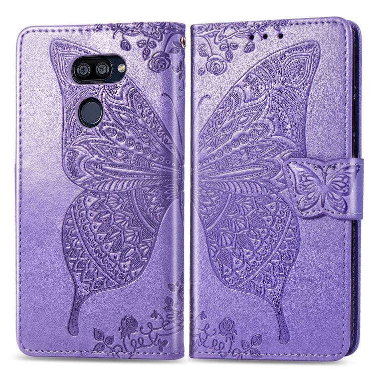 Funda de Cuero para LG K40S Butterfly Love Flower con Tapa Horizontal, Soporte, Ranura para Tarjeta y Cordón (Morado Claro)