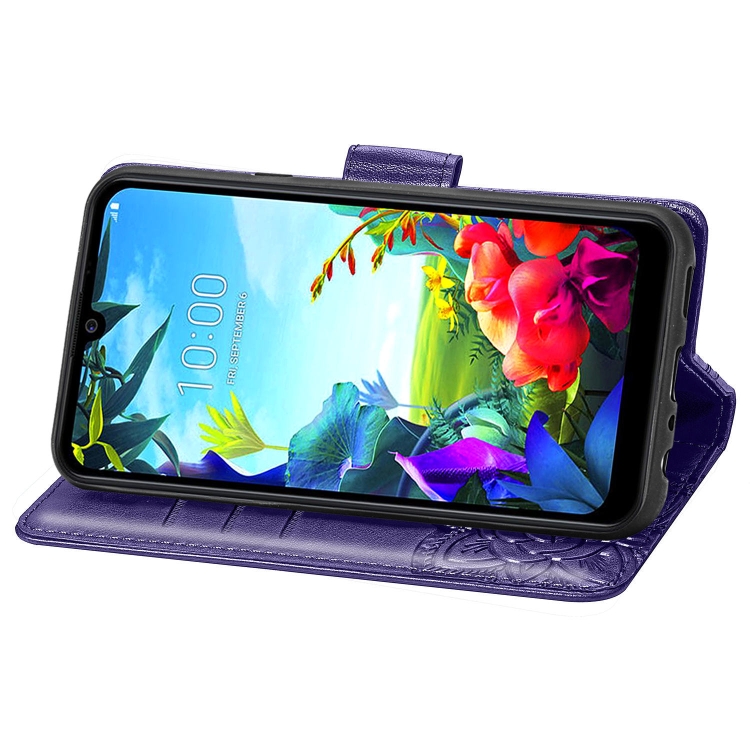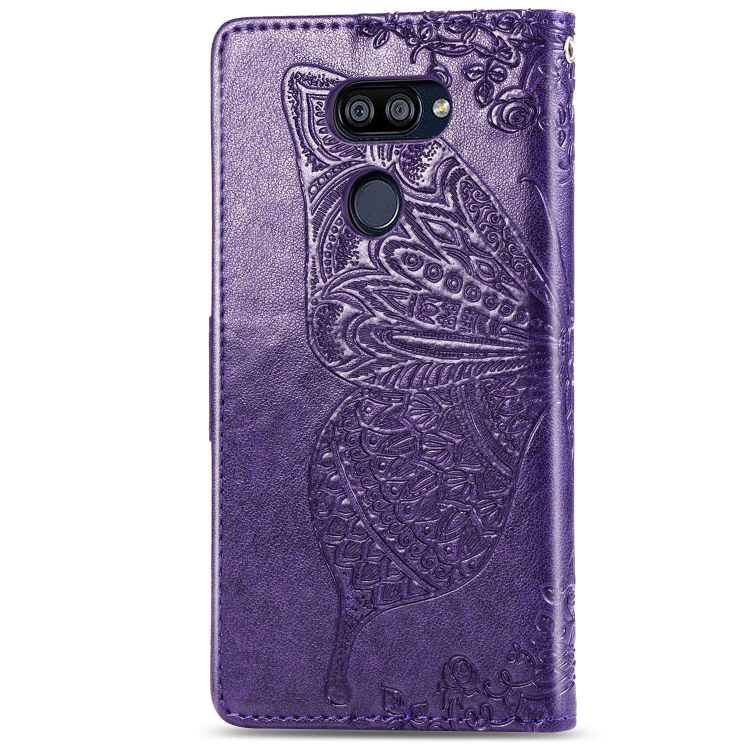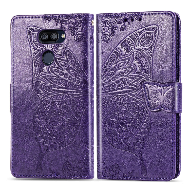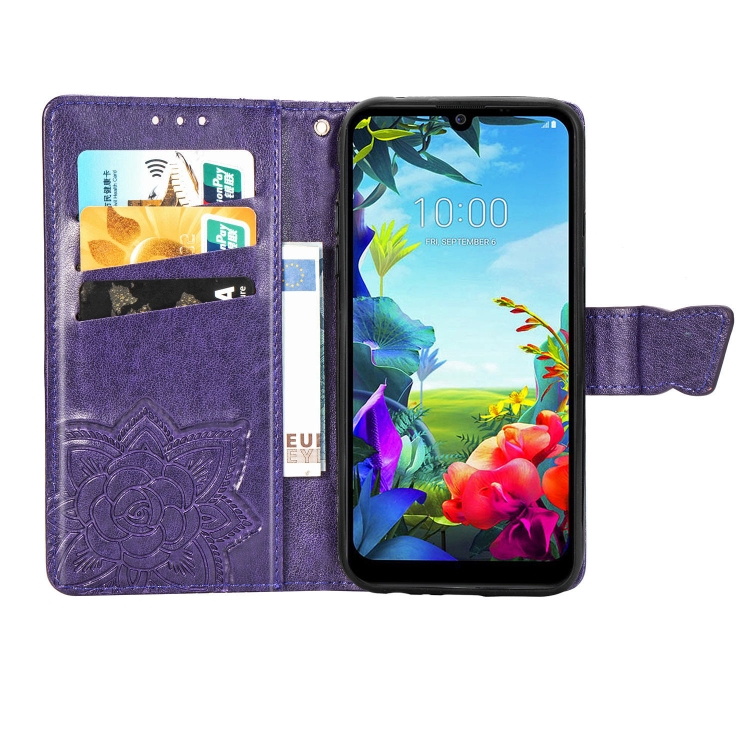 Funda de Cuero para LG K40S Butterfly Love Flower con Tapa Horizontal, Soporte, Ranura para Tarjeta y Cordón (Morado Oscuro)