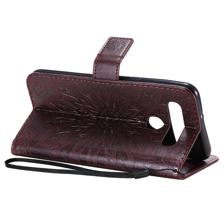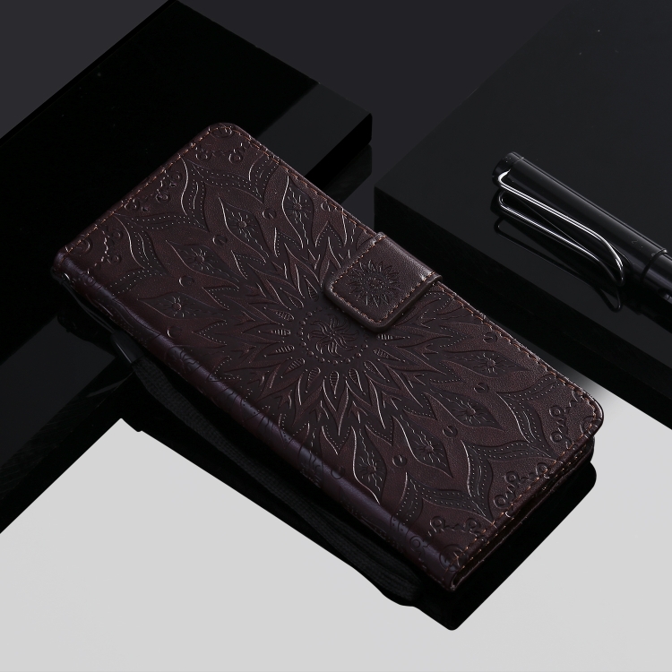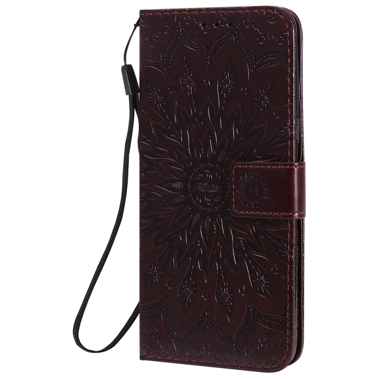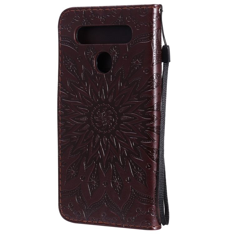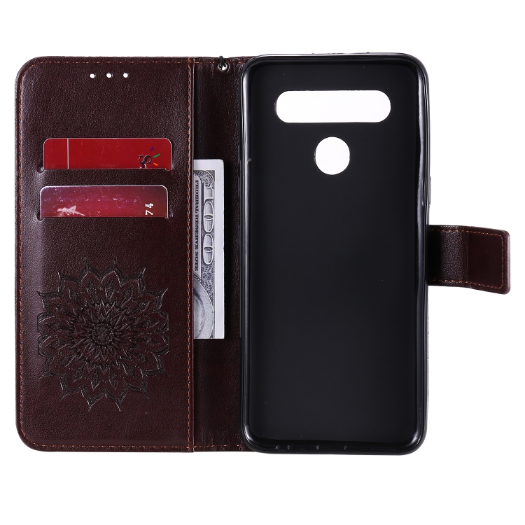 Funda Cuero PU LG K41S y K51S con Patrón Girasol, Tapa Horizontal, Soporte, Ranuras y Cordón (Marrón)