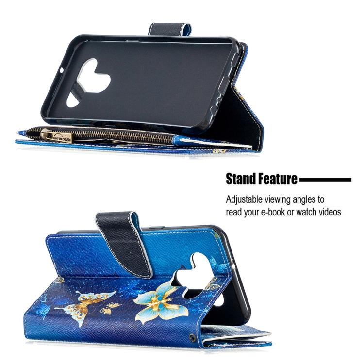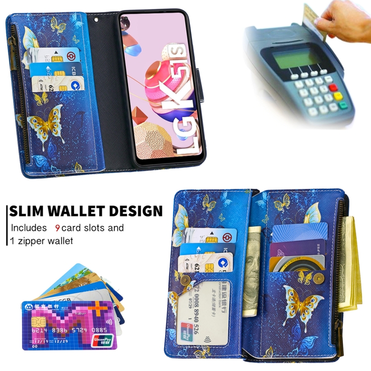 Estuche de Cuero Abatible Horizontal para LG K51 con Cremallera, Soporte, Ranuras y Billetera (Mariposa Dorada)