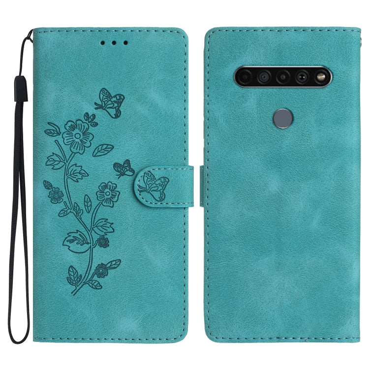 Funda de Cuero para LG K51S con Flor Mariposa y Relieve Patrón (Azul Cielo)