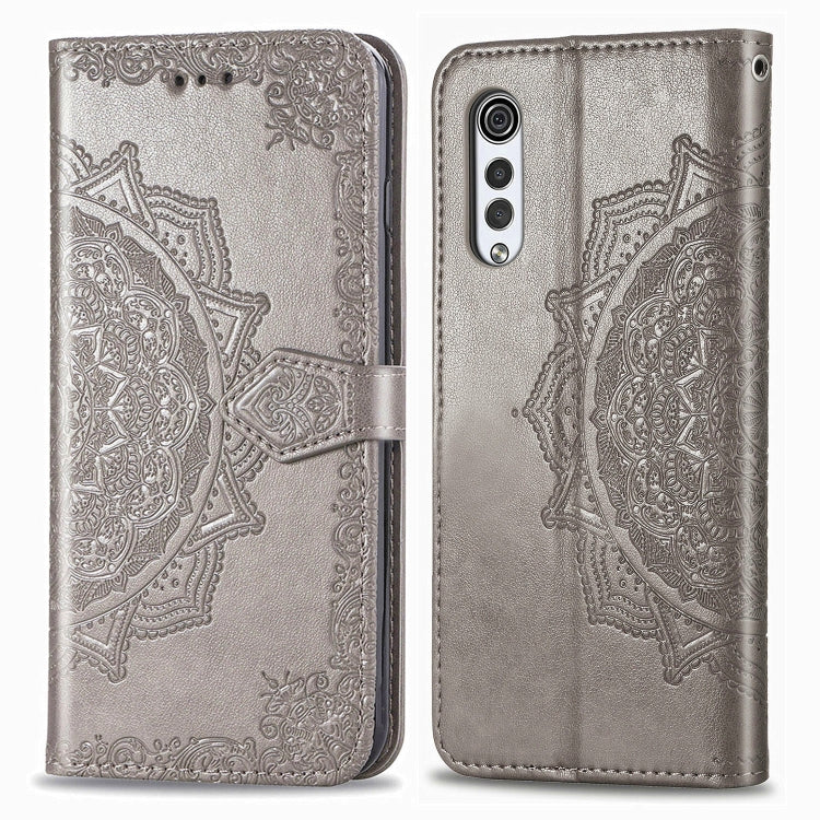 Funda de Cuero LG Velvet 5G Mandala Flower con Tapa Horizontal, Soporte, Ranura para Tarjeta y Cordón (Gris)