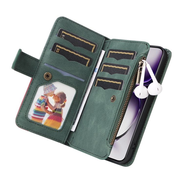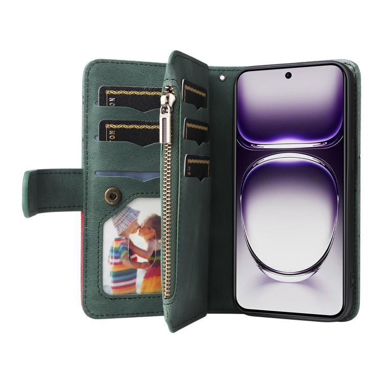 Para Oppo Reno12 5G Global Funda de Cuero para Teléfono con Billetera con Cremallera y 9 Ranuras para Tarjetas de Doble Color (Verde)