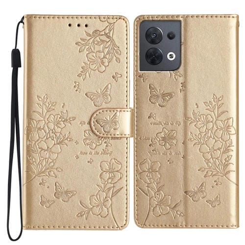 Para Oppo Reno8 5G Global Butterfly Love Flower Funda de Cuero para Teléfono En Relieve (Oro)