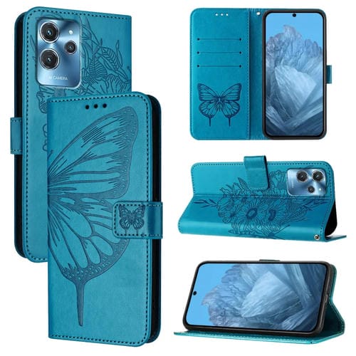 Funda de Cuero para Oukitel C32 con Mariposa en Relieve (Azul)