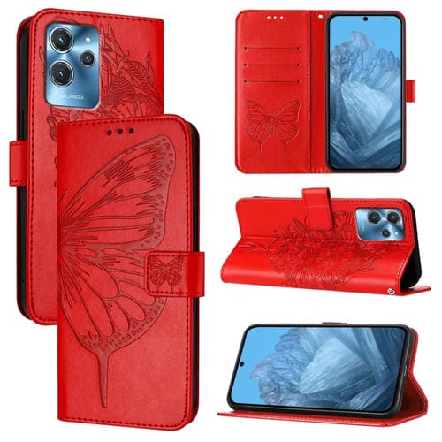 Funda de Cuero para Oukitel C32 con Mariposa en Relieve (Rojo)