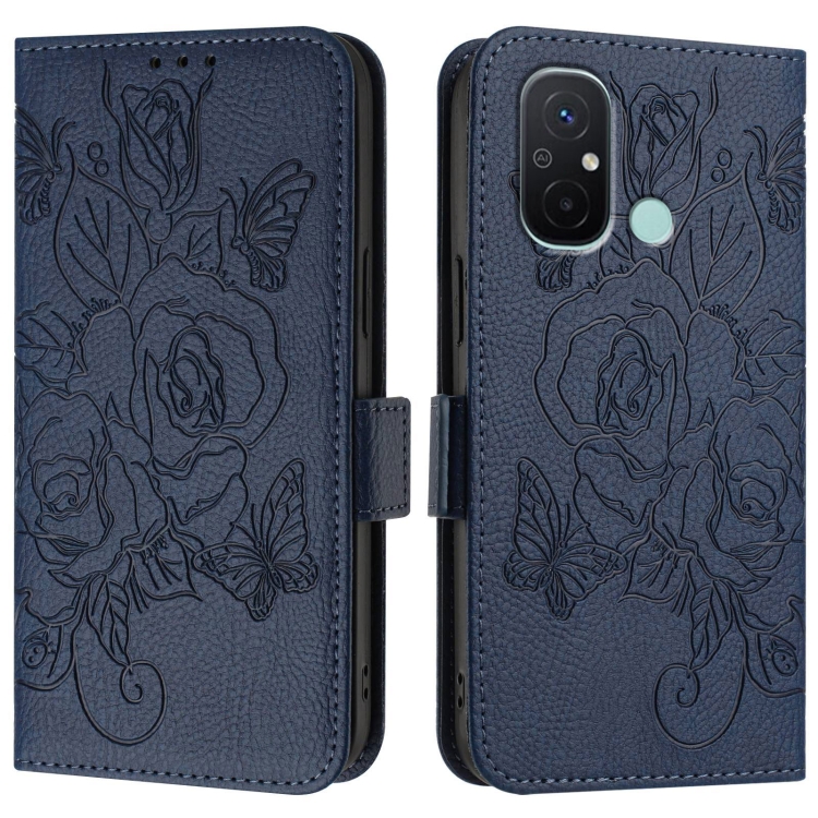 Para Redmi 12C / 11A Funda para Teléfono de Cuero Antirrobo Rfid con Rosa En Relieve (Azul Oscuro)