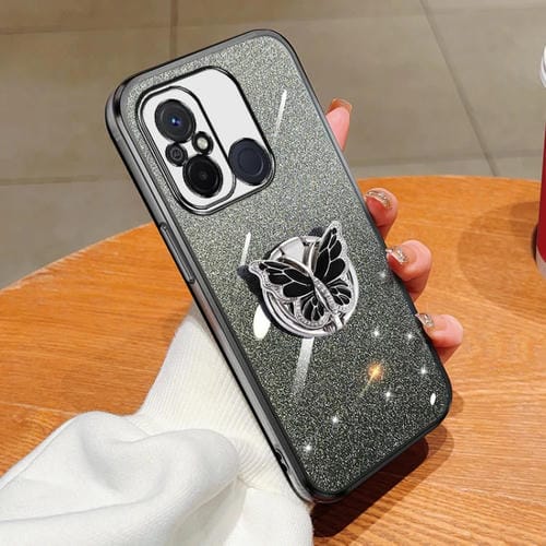 Para Redmi 12C Estuche para Teléfono de TPU con Soporte de Mariposa con Brillo Degradado Plateado (Negro)
