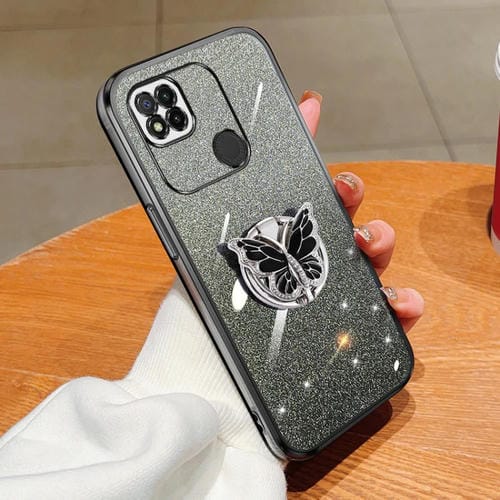 Para Redmi 9C / 10A Funda para Teléfono de TPU con Soporte de Mariposa con Brillo Degradado Plateado (Negro)