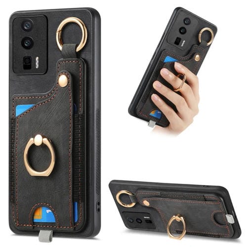 Para Redmi K60 / 60 Pro Funda para Teléfono con Bolsa para Tarjeta con Anillo y Sensación de Piel Retro con Lazo para Colgar (Negro)