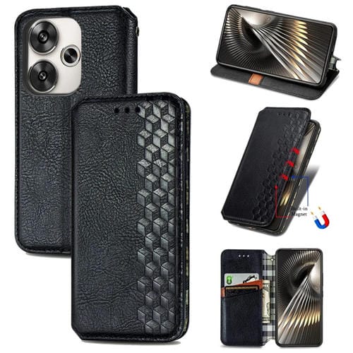 Para Redmi Turbo 3 5G Cubic Grid Funda de Teléfono de Cuero Magnético Prensado (Negro)