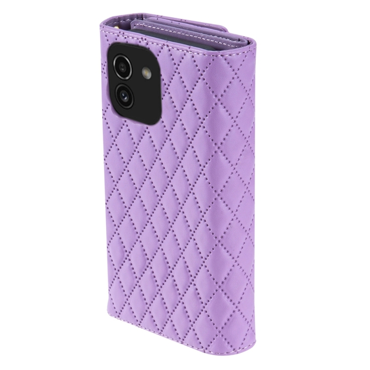 Funda para Teléfono Samsung Galaxy A03 Cuero Rómbico con Billetera MultiTarjeta y Cremallera (Púrpura)
