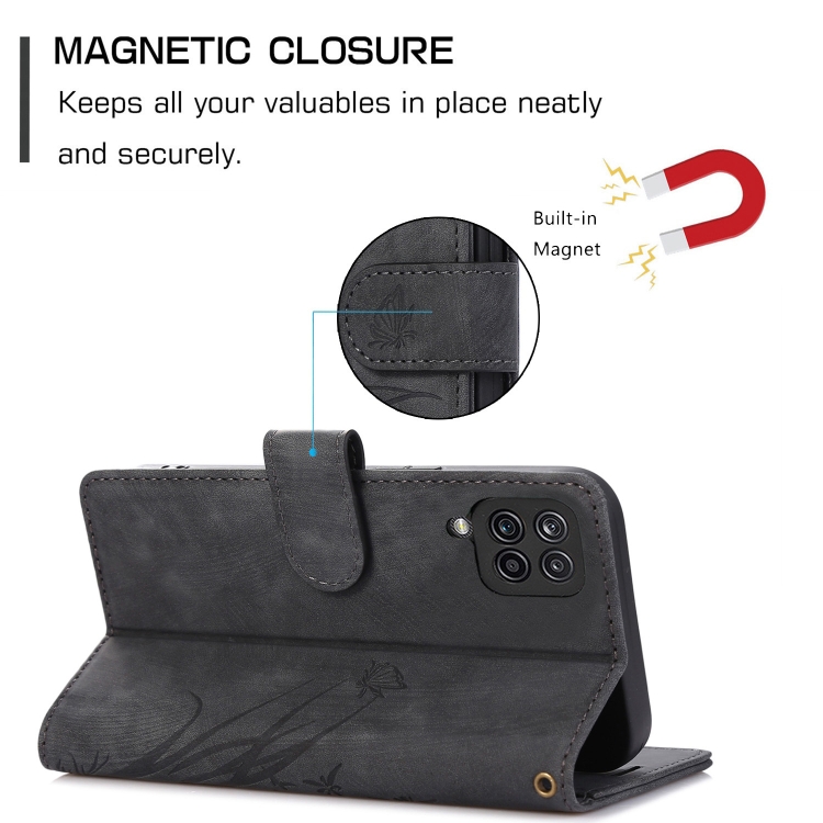 Funda para Teléfono Samsung Galaxy A42 Cuero Relieve Mariposa Orquídea (Negro)