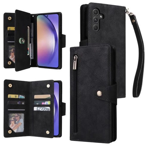 Funda de Cuero Samsung Galaxy A55 con Hebilla y Remache para 9 Tarjetas Billetera de 3 Pliegues (Negro)