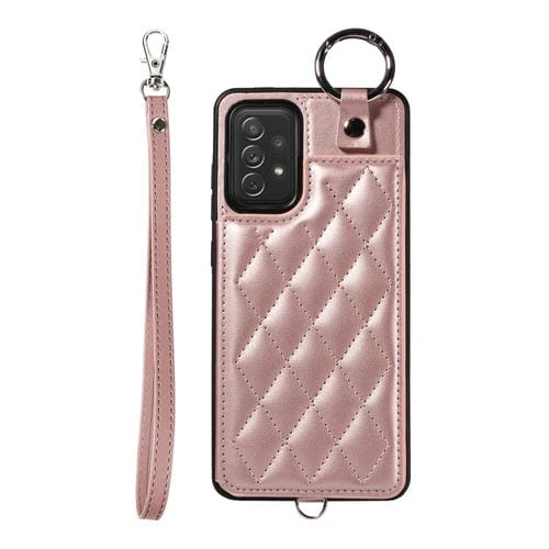 Estuche para Teléfono Samsung Galaxy A72 4G 5G con Bolsa para Tarjetas Textura Rómbica y Cordón Corto (Oro Rosa)