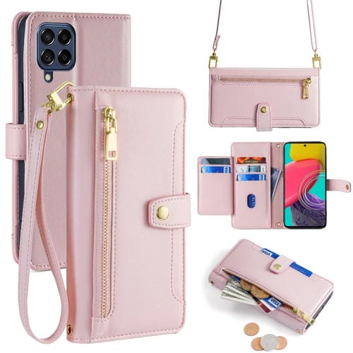 Funda para Teléfono Samsung Galaxy M53 5G Cuero con Billetera Cremallera Cuerpo Cruzado Textura de Oveja (Rosa)