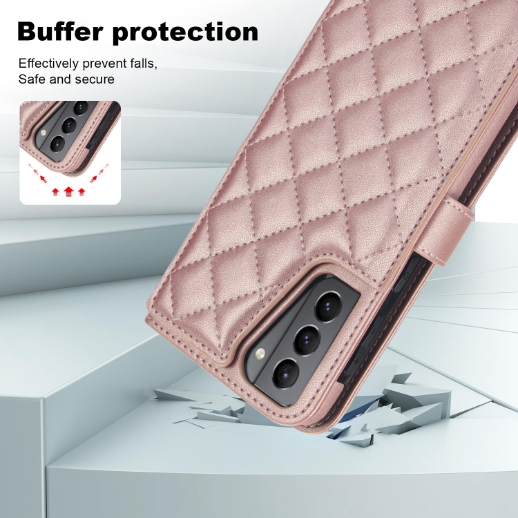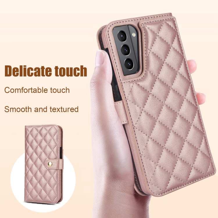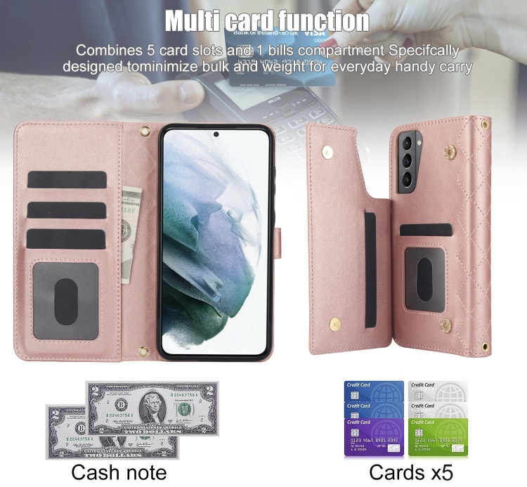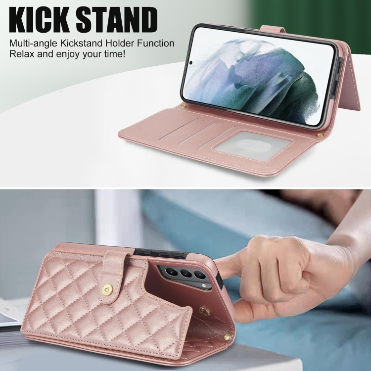 Estuche para Teléfono Samsung Galaxy S21 5G Crossbody Cuero Rómbico Multifunción (Oro Rosa)