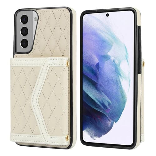 Estuche para teléfono Samsung Galaxy S21 + 5G con bolsa para tarjetas textura rómbica y cordón largo (Beige)