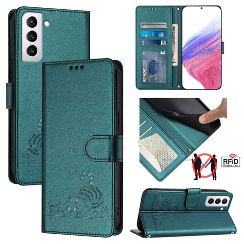 Estuche para Teléfono Samsung Galaxy S21 + Cat Rat con Patrón en Relieve RFID PU con Correa para la Muñeca (Verde Pavo Real)