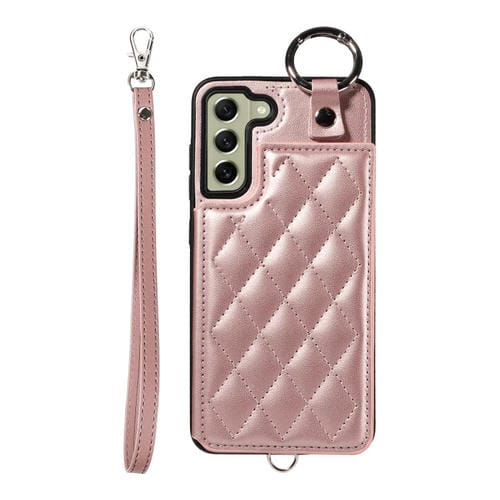 Estuche para teléfono Samsung Galaxy S21 FE 5G con bolsa para tarjeta textura rómbica y cordón corto (Oro Rosa)